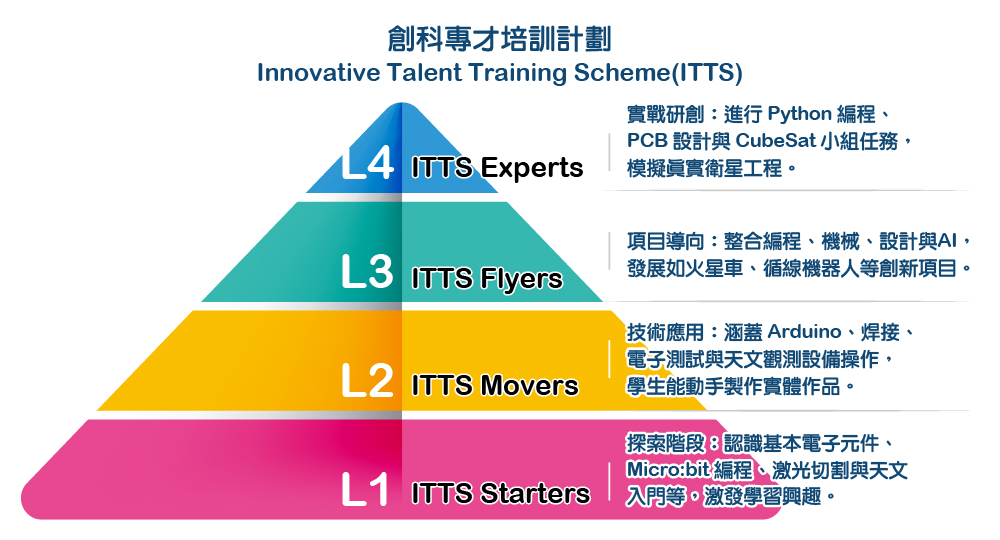 創科專才培訓計劃 源於2003年創立的 天文及機械人學會,當時在舊校成立,並逐步發展出與創新科技相關的課程。隨著2011年新校舍的啟用,我們創建了創意機械實驗室,並於2013年建立香港首個 STEAM實驗室,為學生提供系統化的創新科技課程。2025年,該計劃正式命名為 創科專才培訓計劃 Innovative Talent Training Scheme (ITTS),至此成為本校創科教育的核心項目。