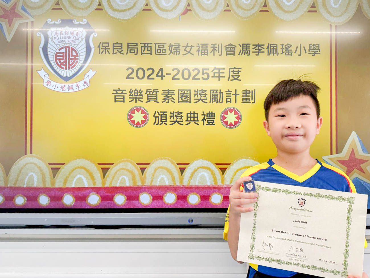 為表揚同學在音樂領域的努力與成就,校方將依據學生每學年的音樂能力評估結果、音樂訓練參與情況、比賽及活動表現進行綜合評核,並統計每學年所獲得的積點數量。這些積點將逐年累積,達到相應標準者,將獲得保良局頒發的金、銀、銅校徽殊榮。